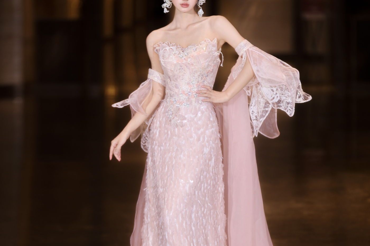 lalisa2024奢华高定品牌婚纱 《皓月》 设计灵感来源于皓月千里,浮光跃金 重工华丽瀑布流裙摆,映射明月光辉 漾起波光粼粼之美。 手工捏褶裙纱轻回流动,花明月暗笼轻雾。 线排钉珠缝饰环绕,以迥巧之艺赋予圣雅高洁。[更多…]